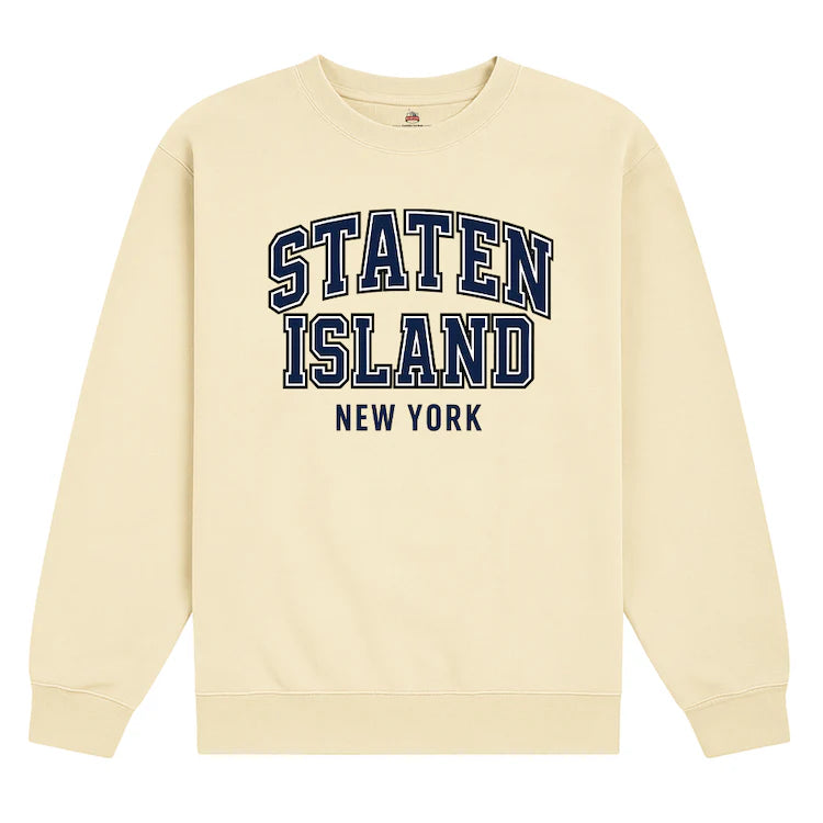 This Staten Island crewneck sweatshirt stands as a genuine declaration of borough allegiance, honoring the Forgotten Borough's distinctive legacy of resilience and community. The tri-color collegiate arch graphic authentically channels vintage varsity aesthetics while grounding itself in Staten Island's coastal identity and underdog ethos. Engineered for reliable comfort and longevity, the sweatshirt serves as both a practical wardrobe staple and a meaningful symbol of local pride. With nine color options available, wearers can express their connection to Staten Island's tight-knit culture in a style that feels both timeless and distinctly personal.