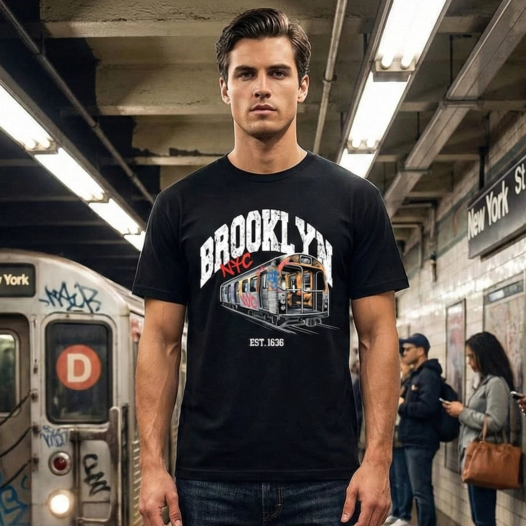 Introducing our Black 100% Preshrunk Heavy Cotton Brooklyn T-Shirt, a tribute to the raw, urban aesthetic of New York City. This striking tee showcases a gutted, graffiti-covered NYC subway train, capturing the gritty essence of the city that never sleeps. Dominating the front, large custom white distressed letters spell out "BROOKLYN," while a bold graffiti red stamp of "NYC" overlays part of the text, adding an edgy twist. At the bottom, "EST. 1636" proudly marks the year Kings County was incorporated, reminding everyone of Brooklyn's deep-rooted history. Perfect for those who appreciate the authentic street art culture and the spirit of NYC, this t-shirt is a must-have for your urban wardrobe.