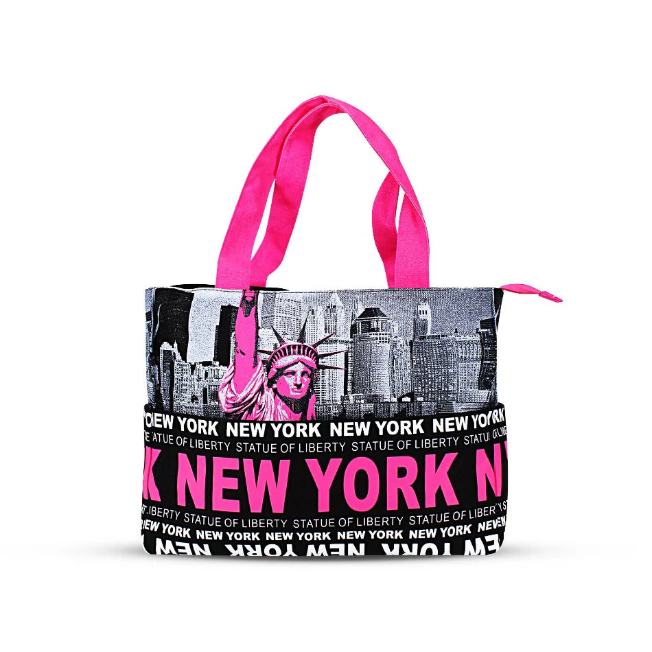 A Timeless design and a testament to New Yorkers, this Canvas New York Totebag employs a Boat-style shape, screen printed black and white design of the New York Skyline with a center piece of a colored Lady liberty. This NY Purse incorporates a Zipper for safety and security while traversing. The lower half of the New York handbag employs a dual pocket flap with a magnetic snap-on lock. The Flap is fully decorated in a "NEW YORK" Block Letter monogram. All stitching is reinforced, allowing for a max carrying capacity of over 250lbs. Enjoy this tote as a fashionable and statement daily driver or make it an excellent gift for all ages!