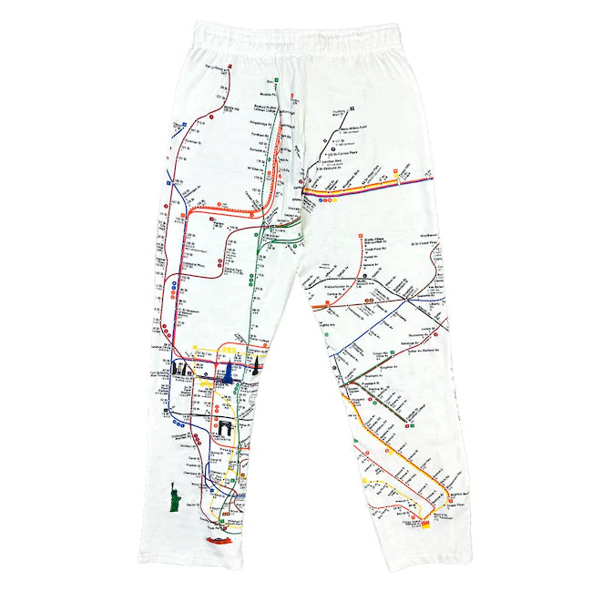 Capture the essence of New York City with our Licensed MTA Pajama Pants, featuring an intricate subway map design that celebrates the city's iconic transit system. The comprehensive map spans the entire garment—front, back, and sides—showcasing all five boroughs from Staten Island to the Bronx in vibrant, detailed screen printing. Crafted for comfort and style, these leisure pants blend urban heritage with everyday wearability. Perfect for transit enthusiasts, NYC natives, or anyone who appreciates metropolitan culture. Available in two versatile colorways to match your personal aesthetic.